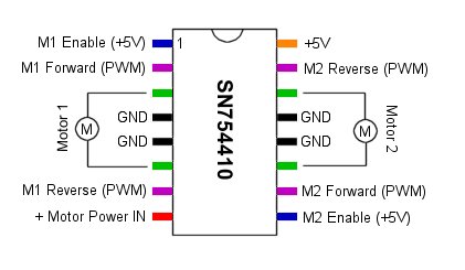 The motor driver IC is a SN754410 and by using two PWM control lines, a single motor can be set to run in both forward and reverse. The Vcc Power In takes up to 36V and is used to power the motor. The Enable, Forward and Reverse lines are 5V and merely used to switch on and off the power from Vcc.